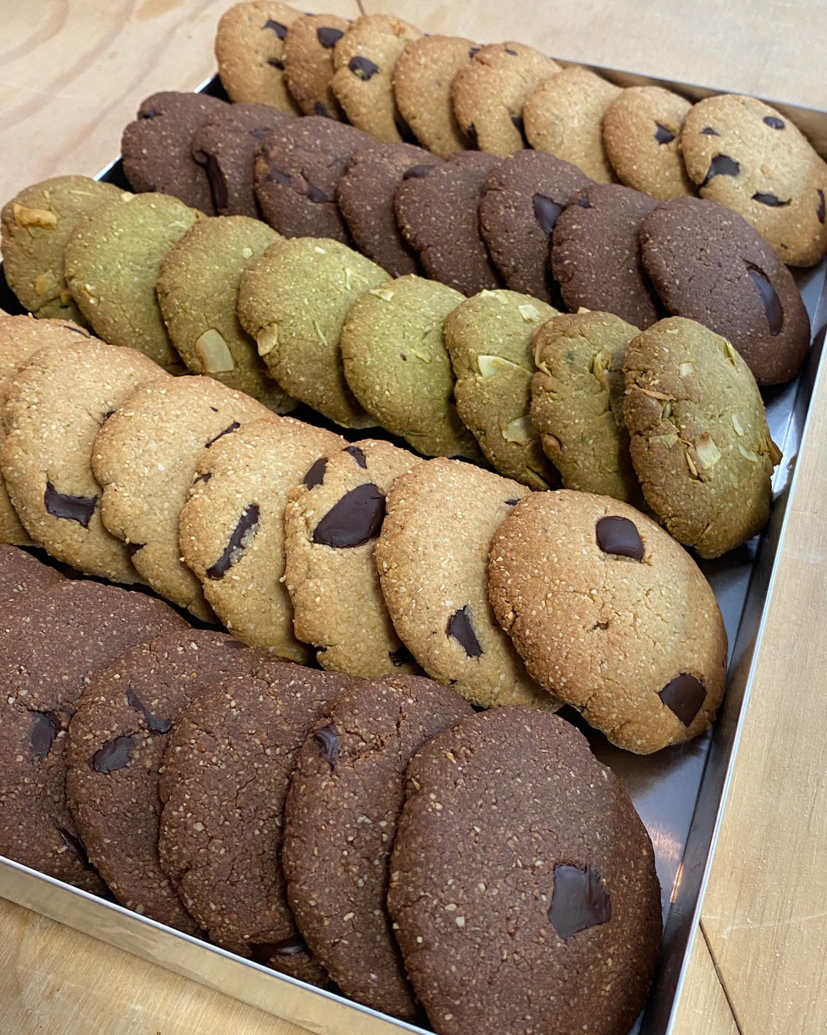 Almendra molida, harina de avena ecológica, dátil, aceite de oliva, chips de chocolate 50% cacao ecológicas (azúcar de caña, pasta de cacao, manteca de cacao y vainilla en polvo), vainilla y sal.