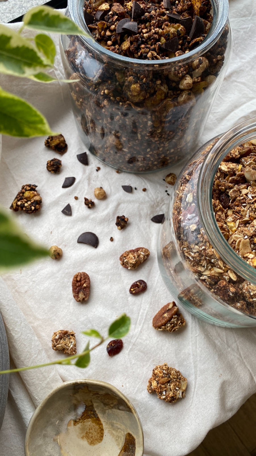 Copos de avena ecológicos, grano de trigo sarraceno, amaranto inflado ecológico, dátil, aceite de oliva, avellana, almendra con piel, sésamo negro, chips de chocolate 50% cacao ecológicas (azúcar de caña, pasta de cacao, manteca de cacao y vainilla en polvo), cacao, vainilla y sal.
