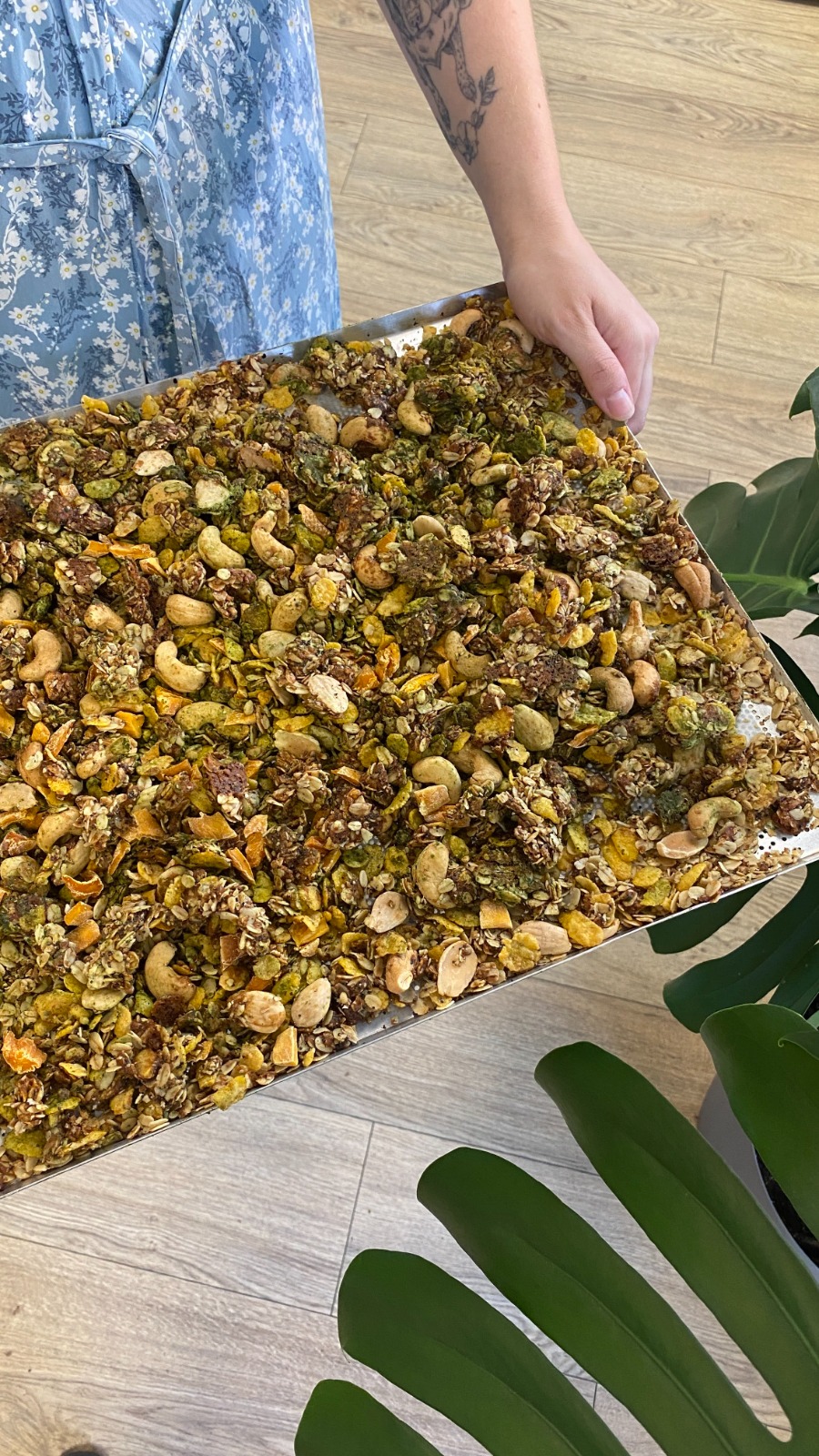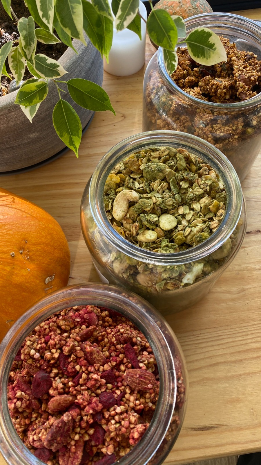Copos de avena ecológicos, grano de trigo sarraceno, amaranto inflado ecológico, dátil, aceite de oliva, anacardo, almendra sin piel, sésamo, mango deshidratado sin azúcar ecológico, té matcha ecológico, vainilla y sal.