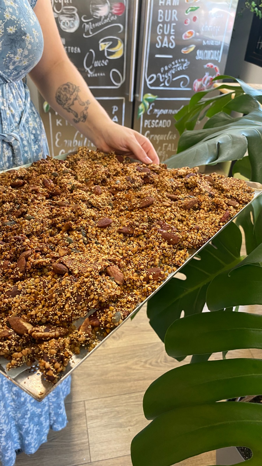 Copos de avena ecológicos, grano de trigo sarraceno, amaranto inflado ecológico, dátil, aceite de oliva, nuez pecana, almendra sin piel, pipas de girasol, arándanos, vainilla y sal.